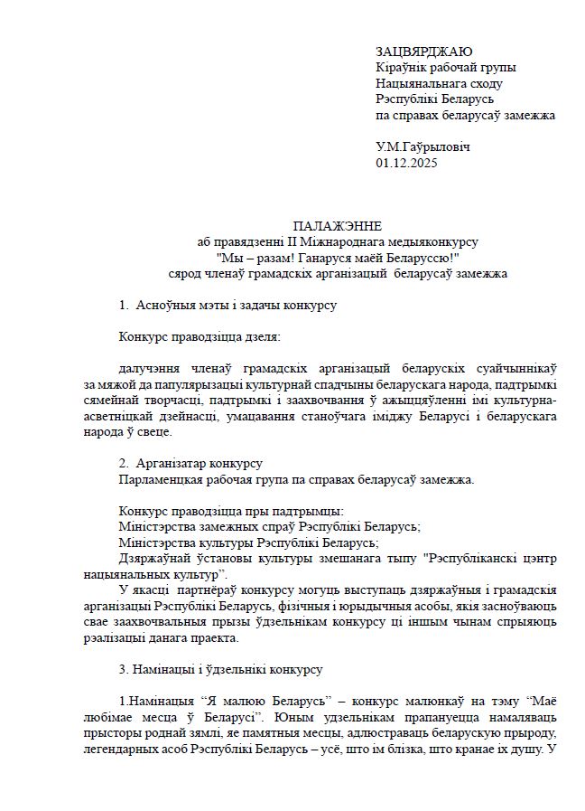 05.02.2026 г.Парламентская рабочая группа по делам белорусов зарубежья совместно с Министерством иностранных дел, Министерством культуры Беларуси и Республиканским центром национальных культур проводит II Международный медиаконкурс «Мы вместе! Горжусь своей Беларусью!» среди членов общественных объединений белорусов зарубежья.