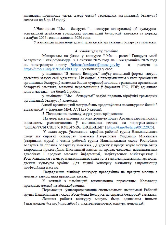 Конкурсные работы принимаются исключительно в цифровом формате путем направления сообщений на электронную почту belarus.konkurs@house.gоv.by и/или Telegram-канал https://t.me/+E4q2E7BbalVkOTIy.